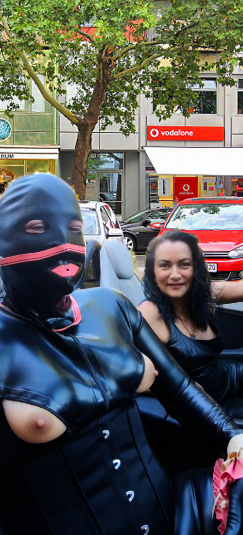Meine Rosa-Latex-Fetischistin wurde zunächst von mir angekleidet mit rosa Strumpfbändern, rosa Rüschen-Armbändern, einer femininen Latexmaske und einem entsprechenden Halsband sowie Korsett. Dann beginnt zunächst das Lauftraining in High Heels, anschließend ein kurzes Fotoshooting.